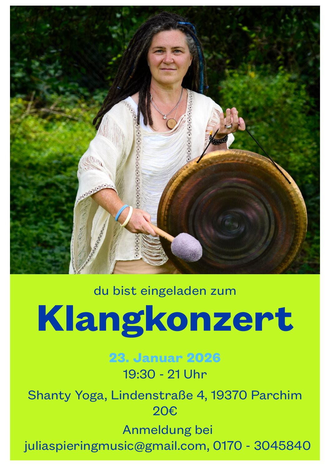 Am 23. Januar findet in Parchim das nächste Klangkonzert bei Shanti Yoga mit Julia Spiering statt.